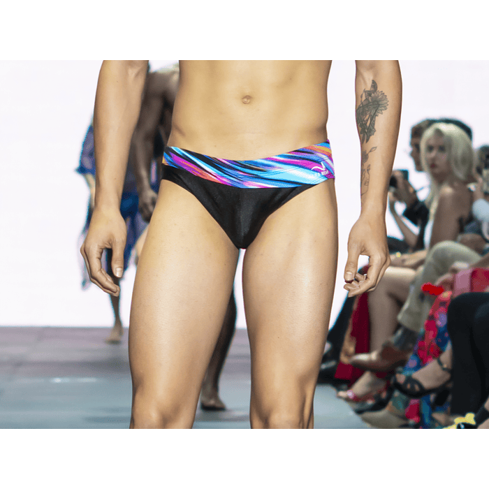 Inspirado en la bella y colorida costa mediterranea de España , conocida como Costa del Sol. Este cómodo y colorido traje de baño tipo Brief sin duda hará que todos los ojos se fijen en ti. Tiene dos partes: una multicolor que desciende en diagonal y una sólida en este caso fucsia.